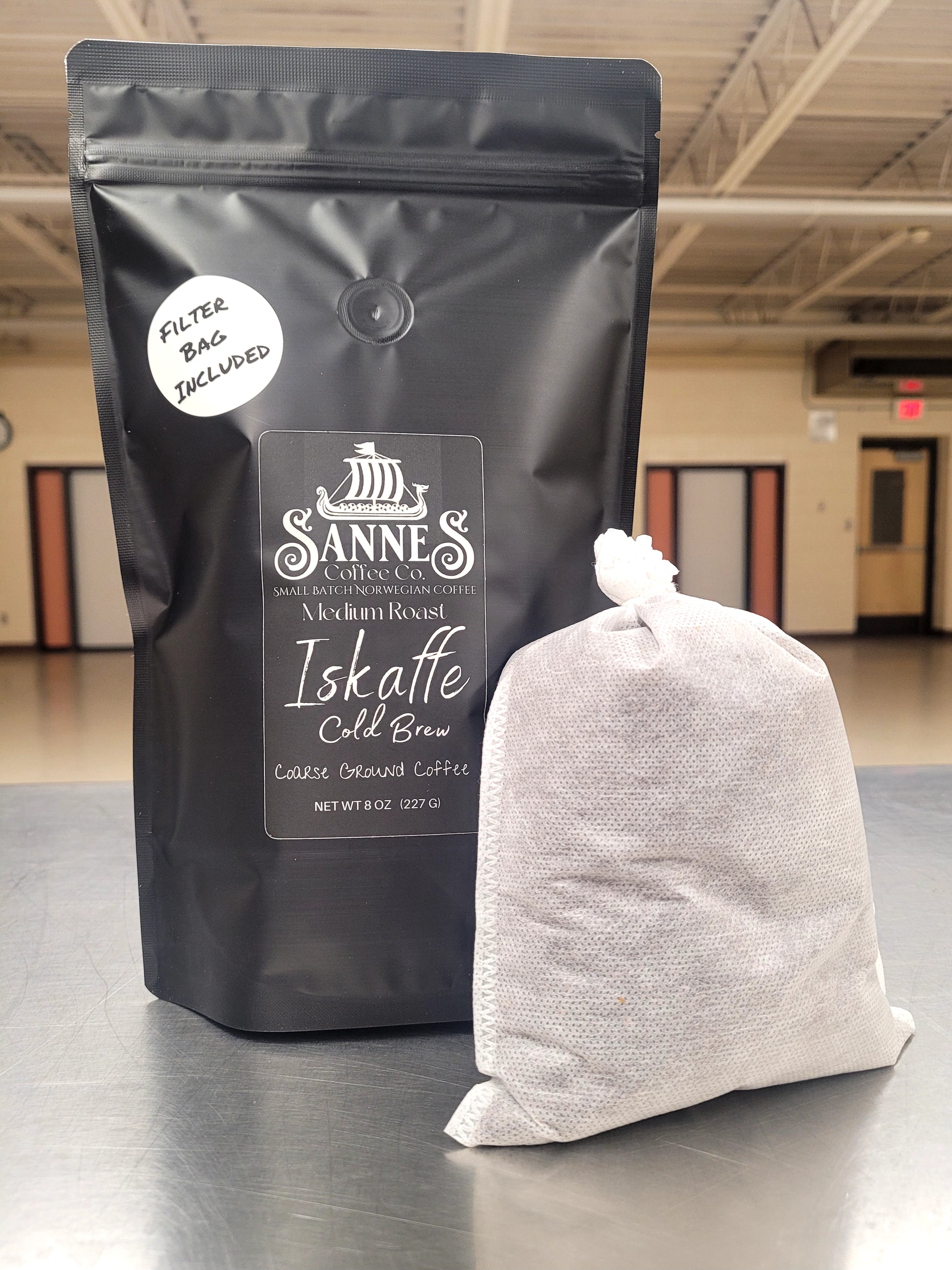 Our Iskaffe, which means iced coffee in Norwegian, offers a clean, crisp, and refreshing taste. It is conveniently packaged in an 8oz filter bag. Simply place it in a pitcher, add 8 cups of water, and let it steep in the refrigerator overnight. This process yields a concentrated coffee, which you then dilute with 8 cups of cold water to make a full gallon of coffee.